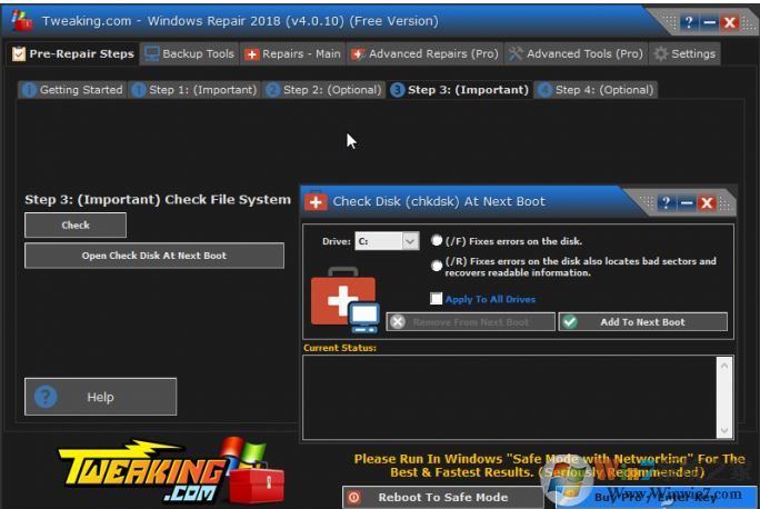 3、在預(yù)修復(fù)設(shè)置(Pre-Repair Setups)選項卡向?qū)О奈鍌€步驟中,實際上只有后四個是為預(yù)修復(fù)過程而設(shè)計的。點擊Go to Step 1開始修復(fù)前的準(zhǔn)備工作,首先要求進(jìn)行一次系統(tǒng)重啟,這時更建議啟動到安全模式,為此可點擊底部的Reboot To Safe Mode按鈕啟動到安全模式。