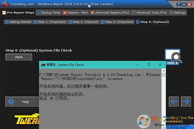6、最后一步預(yù)修復(fù)過程是系統(tǒng)文件檢查(System File Check),點擊Check按鈕后,會啟動管理員命令提示符窗口并自動執(zhí)行sfc /scannow命令,對系統(tǒng)文件的完整性進(jìn)行檢查,如下圖所示: