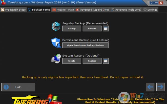 7、可以點擊Repair Main選項卡,進(jìn)行實質(zhì)性的修復(fù)選擇了。軟件默認(rèn)會啟用一個Automatically Do A Registry Backup選項,意思是在修復(fù)前先自動對注冊表進(jìn)行備份。在可選擇的6個修復(fù)模塊中,有5個預(yù)設(shè)模塊(Preset),分別可進(jìn)行自動進(jìn)行惡意破壞修復(fù)(Malware Cleanup Repair)、常規(guī)修復(fù)(Common Repair)、系統(tǒng)升級修復(fù)(Windows Updates)、僅修復(fù)許可項(Permissions Only)、修復(fù)所有(All Repair)等的項目選擇。