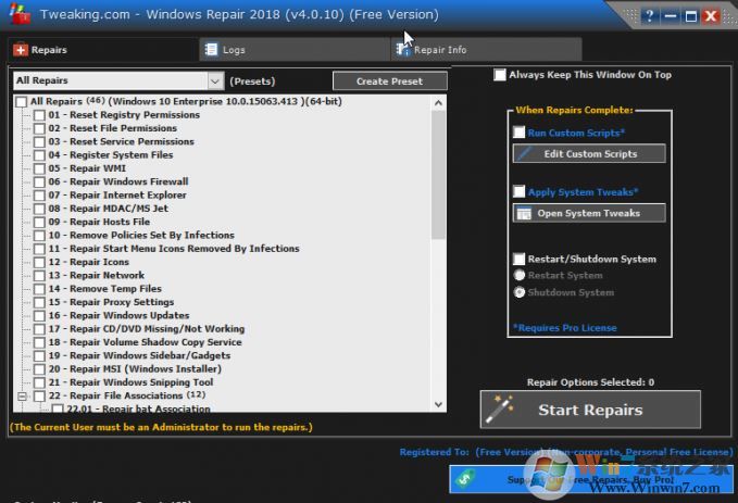 8、Open Repair則可以打開詳細(xì)的修復(fù)選擇窗口,在該窗口的修復(fù)列表中,我們可以按實際需要更加靈活地選擇各種修復(fù)功能選項。其中包括用進(jìn)程管理診斷和分析系統(tǒng)模塊;對自啟動項進(jìn)行分析,對可疑自動起動項高亮顯示并清除;對系統(tǒng)加載模塊進(jìn)行分析,對可疑模塊進(jìn)行高亮顯示并卸載清除;清理Windows外殼非法的設(shè)置;清除無效注冊表數(shù)據(jù)和用戶歷史記錄等等,不一而足。以64位版的Windows 10為例,可選修復(fù)的大項有33種之多。我們只需根據(jù)系統(tǒng)故障的方向,按照實際需求進(jìn)行復(fù)選,最后點擊右下角的Start Repairs按鈕執(zhí)行修復(fù)動作即可。
