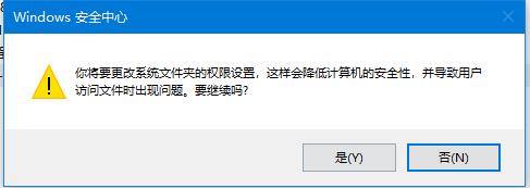 8.點擊后,系統(tǒng)提示你將要更改系統(tǒng)文件夾的權限設置,這樣會降低計算機的安全性,并導致用戶訪問文件時出現(xiàn)問題。要繼續(xù)嗎?我們點擊是。如下圖所示。