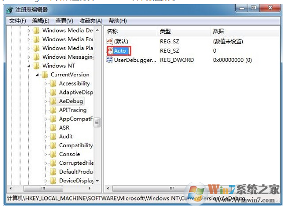 CurrentVersion\AeDebug”,并雙擊打開(kāi)“Auto”項(xiàng),如圖所示: