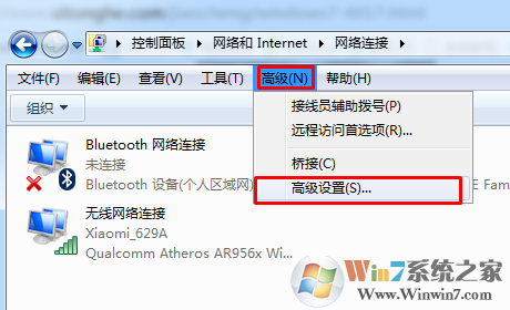 3、在網(wǎng)絡連接界面工具欄上點擊“高級”,選擇“高級設置”;