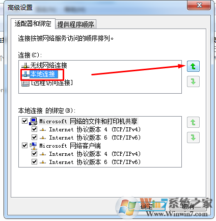 4、在高級設置窗口的“適配器和綁定”選卡的“連接”框內(nèi)選定“本地連接”,然后點擊右側的向上箭頭,接著“本地連接”就會跑到第一位,然后點擊確定即可。