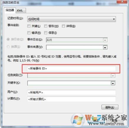 4、雙擊“篩選當(dāng)前日志”,在圖中紅框處輸入你需要查找的事件ID,中間用“,”隔開: