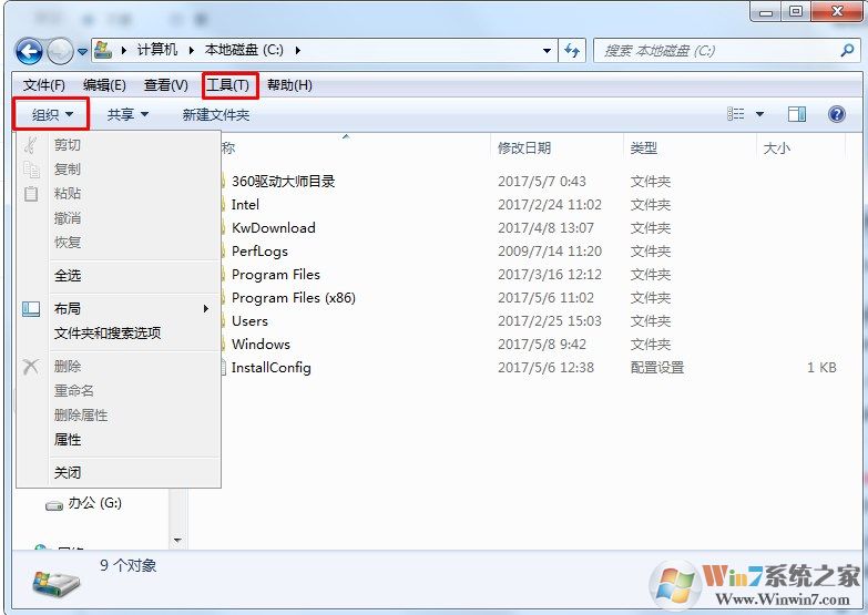 1、在文件夾左上方找到組織選項,沒有組織的找到工具,點擊打開