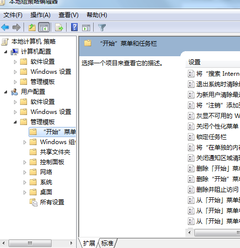 2、在框中左側(cè)依次展開“用戶配置—管理模板—開始菜單和任務(wù)欄”;