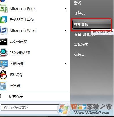 1、打開開始菜單,在右邊欄目只找到控制面板