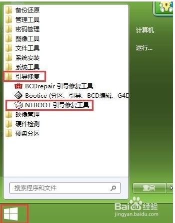 3、進入U盤啟動盤PE后,在開始菜單找到引導(dǎo)修復(fù)工具