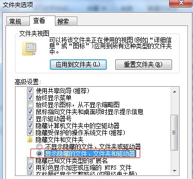 4、在文件夾中找到”查看“,并在高級(jí)設(shè)置中選擇“顯示隱藏的文件,文件夾和驅(qū)動(dòng)器”,如圖: