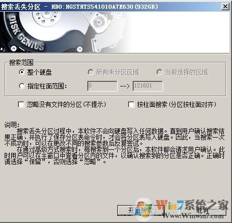 3、打開 DiskGenius 軟件,選中有 RAW 問題的磁盤,點鼠標右鍵,選中“搜索已丟失分區(qū)(重建分區(qū)表)”,搜索范圍選中“整個硬盤”,然后點擊“開始搜索”按鈕。