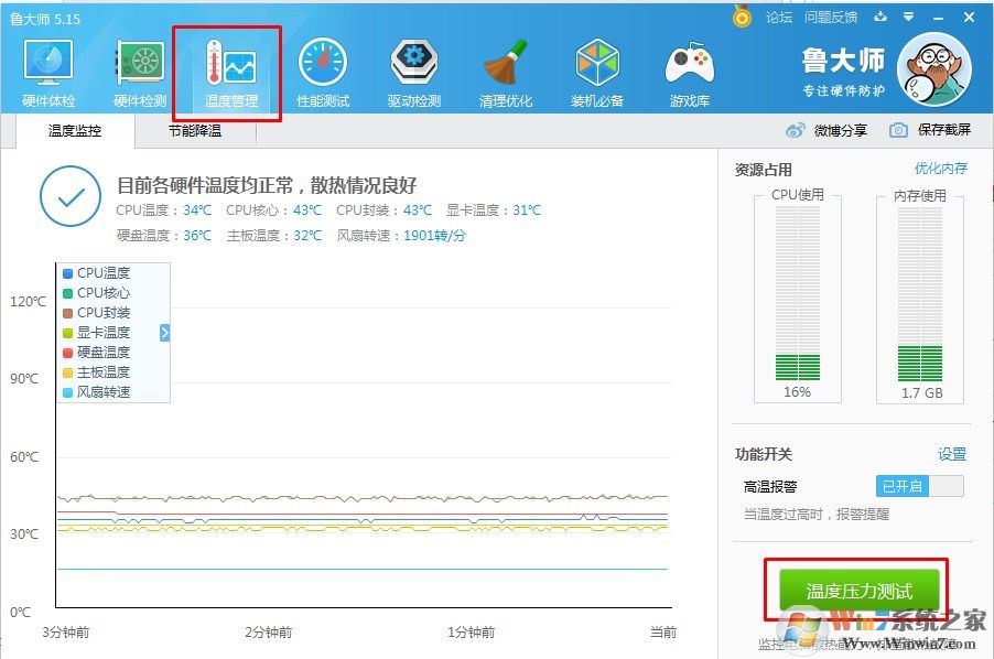 3、打開(kāi)硬件檢測(cè),對(duì)cpu、主板和顯卡進(jìn)行溫度壓力測(cè)試