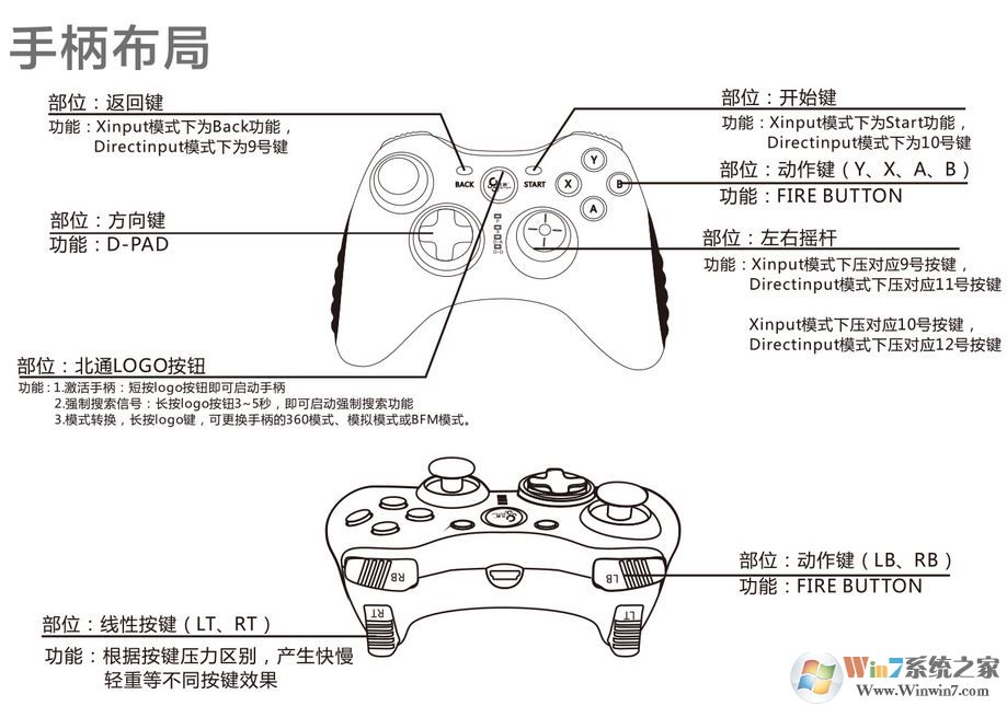北通游戲手柄怎么用?游戲愛(ài)好者想要在電腦中使用手柄來(lái)玩游戲的話該如何使用手柄進(jìn)行連接呢?本文中winwin7小編將給大家分享介紹下北通游戲手柄的使用方法,有需要的用戶不要錯(cuò)過(guò)快來(lái)試試吧!首先大家可以看一下下面這張圖為手柄的按鍵功能分布圖。