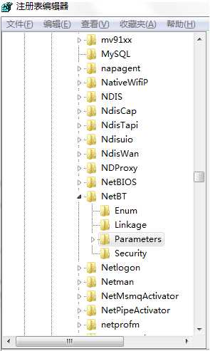 2、依次依次點(diǎn)擊注冊(cè)表選項(xiàng)”HKEY_LOCAL_MACHINE\SYSTEM\CurrentControlSet\services\NetBT\Parameters“,進(jìn)入NetBT這個(gè) Win7系統(tǒng)之家 cncxm.com