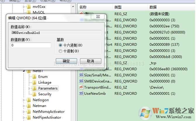 3、在右邊空白處右擊新建“QWORD(64位)值”,然后重命名為“SMBDeviceEnabled”,再把這個(gè)子鍵的值改為0。
