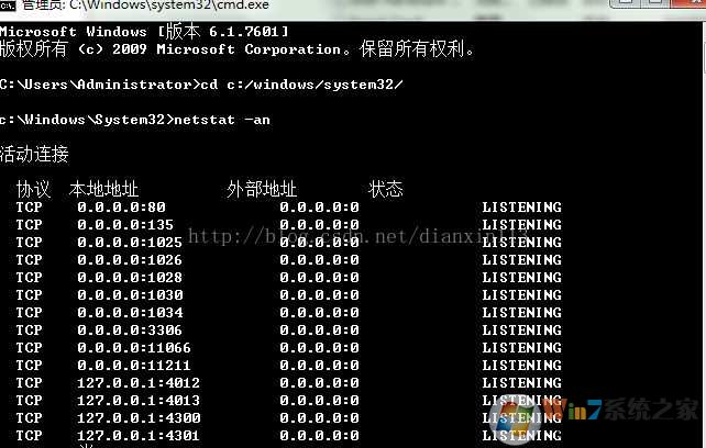 cmd命令行中輸入“netstat -an”查看端口狀態(tài),但如果直接輸入會(huì)無(wú)法識(shí)別netstat命令。所以要“cd c:/windows/system32/”切換,然后再執(zhí)行