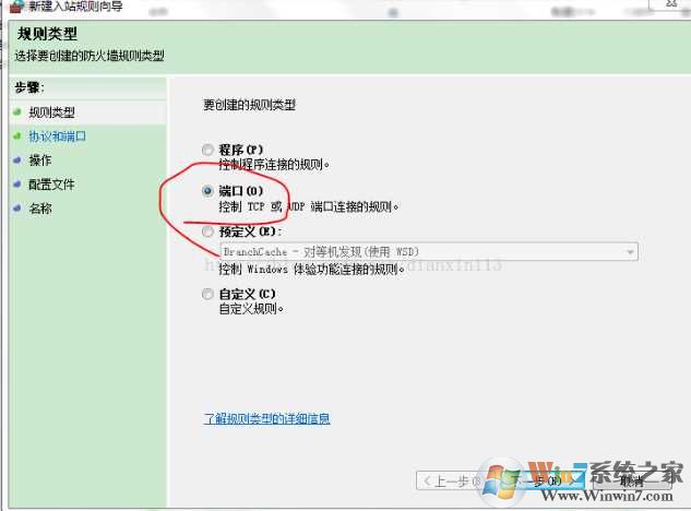 3、在要?jiǎng)?chuàng)建的規(guī)則中選擇“端口”。 點(diǎn)擊下一步。