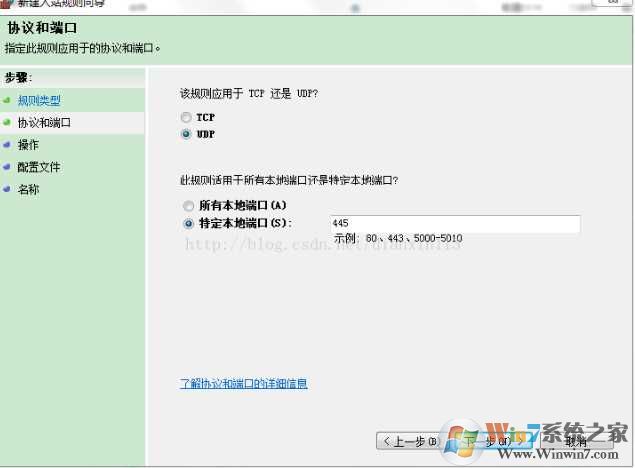 4、然后選擇UDP 再選擇特定本地端口,輸入要關(guān)閉的端口號(hào) 如 445 點(diǎn)擊下一步