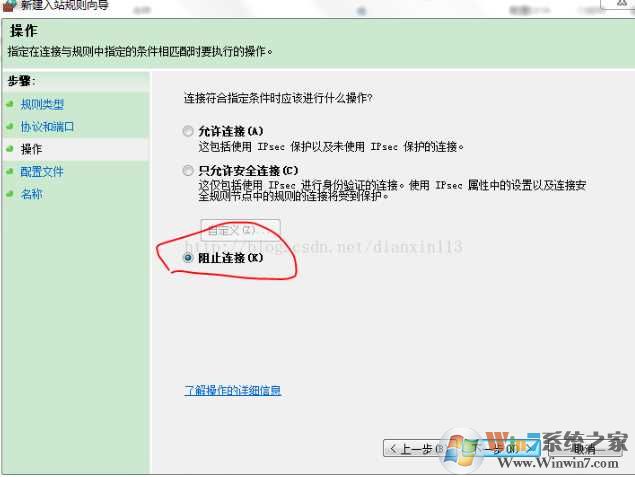 5、選擇“阻止鏈接”。點(diǎn)擊“下一步”。