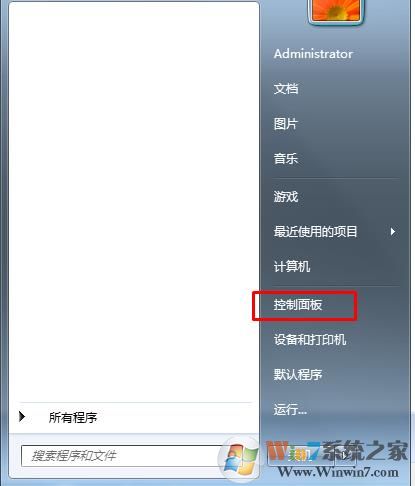 1、點擊開始菜單——打開控制面板,如下圖;