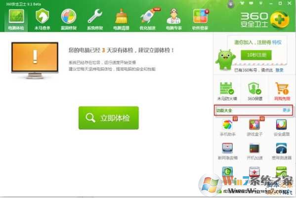 a.打開(kāi)360安全衛(wèi)士,在右邊"功能大全"中點(diǎn)擊“更多”。