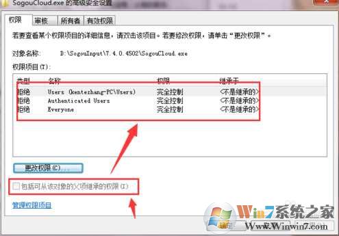 5、選擇更改權(quán)限,在更改權(quán)限選項(xiàng)卡中把“包括可從該對(duì)象的父項(xiàng)繼承的權(quán)限”前的勾勾掉,然后把所有權(quán)限項(xiàng)目都從允許改為拒絕,有些給不了的,選擇清除清除掉。