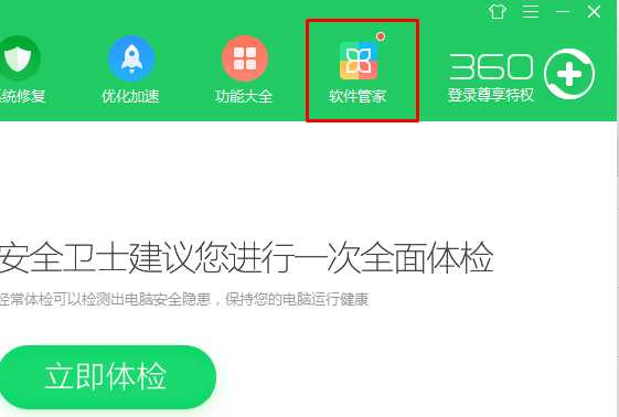 1、打開360安全衛(wèi)士,然后點擊“軟件管家”,也可以多桌面打開軟件管家;