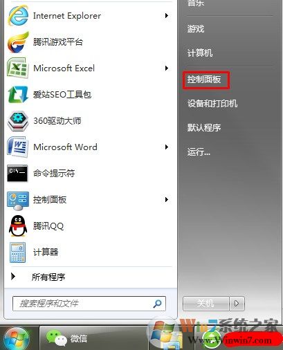 1、首先打開桌面右下角的開始菜單,選擇控制面板選項;