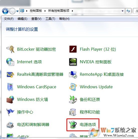 2、然后在可控制面板的調(diào)整計算機的設(shè)置下選擇點擊“電源選項”項;