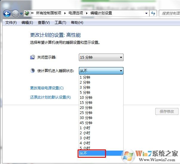 4、接著在計算機進入休眠狀態(tài)中選擇“從不”,最后點擊“保存修改”按鈕即可。