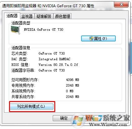 在高級設(shè)置的選項頁面中,默認顯示的欄是適配器一欄,在適配器的最下方有一個列出所有模式的按鈕。用鼠標點擊一下這個選項。