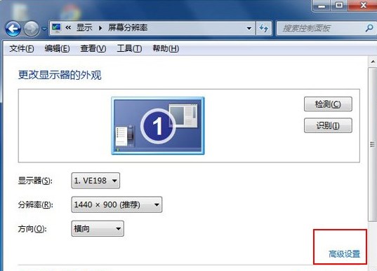 4,這時(shí)候打開(kāi)了win7屏幕分辨率窗口了,然后我們可以在上面設(shè)置分辨率大小,不過(guò)現(xiàn)在我們說(shuō)的不是分辨率的問(wèn)題,繼續(xù)點(diǎn)擊打開(kāi)【高級(jí)設(shè)置】按鈕,如圖所示:
