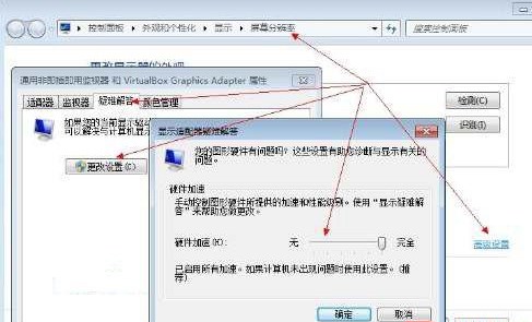 5,現(xiàn)在彈出了一個(gè)新的小窗口,在上面切換到【疑難解答】選項(xiàng)卡,然后窗口上點(diǎn)擊【更改設(shè)置】按鈕即可打開(kāi)硬件加速窗口,通過(guò)調(diào)整滑塊來(lái)對(duì)硬件進(jìn)行加速了。如圖所示: