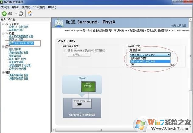 2、打開以后我們會看到下面窗口。首先我們要選擇3D設(shè)置里面的配置Surround、physX 在里面選擇需要調(diào)節(jié)的顯卡選項(xiàng),否則有可能調(diào)半天調(diào)到CPU上哦。