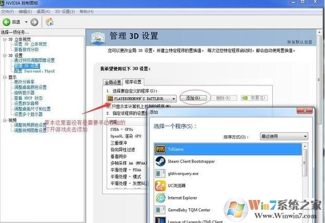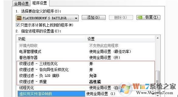 5、在這里朋友們可以看到有兩個設(shè)置,一個是全局設(shè)置、一個是程序設(shè)置,推薦大家使用程序設(shè)置,這樣的話除了吃雞更改了低配模式,其他的不會太乞丐。