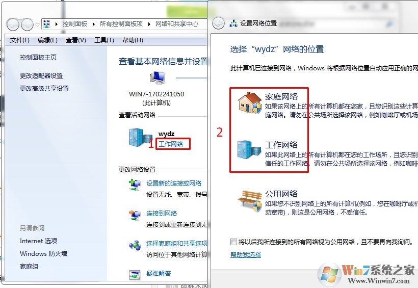 2、接著在打開“控制面板/網(wǎng)絡(luò)和共享中心”,點(diǎn)擊“查看活動(dòng)網(wǎng)絡(luò)”下方的圖標(biāo),將網(wǎng)絡(luò)屬性設(shè)置為家庭或工作;