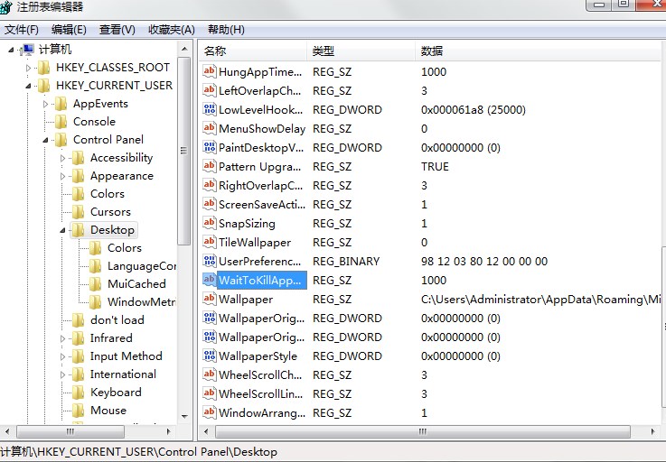 2、打開注冊表編輯器后,然后在左側列表中依次展開到“HKEY_CURRENT_USER\Control Panel\Desktop”;