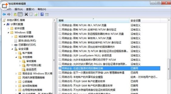 2、打開電腦的組策略編輯器窗口之后,您依次點擊左側菜單中的“Windows設置”→“安全設置”→“本地策略”→“安全選項”→“安全選項”,然后將右側窗口中的網絡安全:在超過登錄時間后強制注銷禁用掉