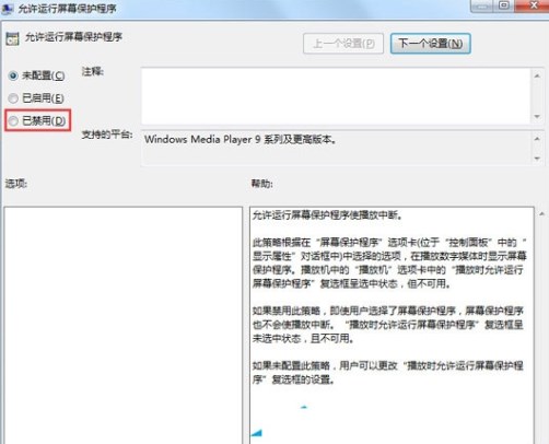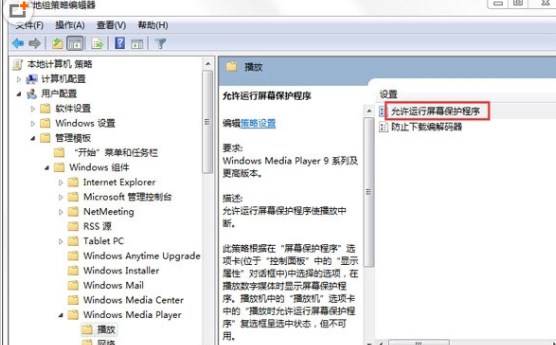3、如上述操作打開電腦的組策略編輯器窗口,然后依次點擊展開“用戶配置”→“管理模板”→“Windows組件”→“WindowsMediaPlayer”→“播放”,然后雙擊右側窗口中的允許運行屏幕保護程序,將狀態(tài)設置為已禁用;