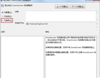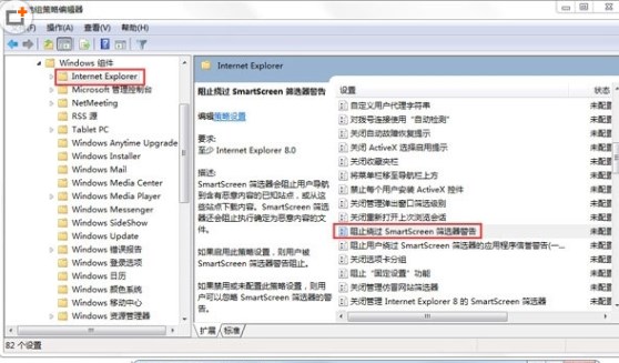 4、依次展開“管理模板”→“Windows組件”→“Internet explorer”,然后將右側窗口中的阻止繞過SmartScreen篩選器警告項禁用。