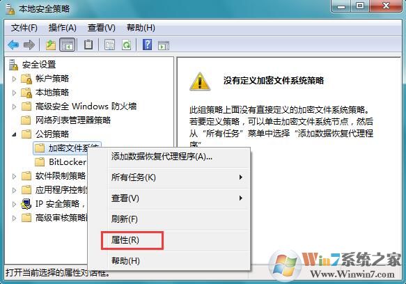 2、 “安全設(shè)置——公鑰策略——加密文件系統(tǒng)”項。然后在“加密文件系統(tǒng)”上右擊,選擇“屬性”。