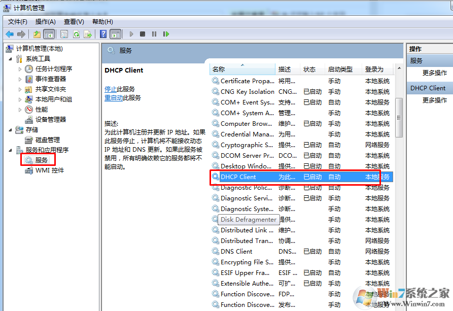 3、如果win7系統(tǒng)dns服務(wù)器出現(xiàn)問題,有必要將網(wǎng)卡禁用,再重啟看看?;蚴窃诳丶姘迳希c(diǎn)擊“管理工具”-“服務(wù)”,在服務(wù)面板上找到dhcp client服務(wù)并設(shè)置為自動(dòng),再把該服務(wù)啟動(dòng)起來即可。