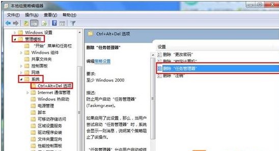 2、這時(shí)我們就進(jìn)入到策略組中了,我們?cè)凇居脩襞渲谩?mdash;—【管理模板】——【系統(tǒng)】——【Ctrl+ATL+DEL】選項(xiàng)下找到“刪除任務(wù)管理器”;