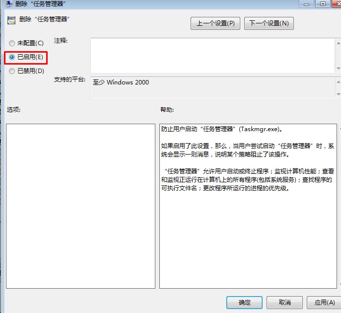 3、雙打該選項(xiàng),并在設(shè)置窗口中,將“未配置”設(shè)置為“已啟用”,然后應(yīng)用,確定保存該策略;