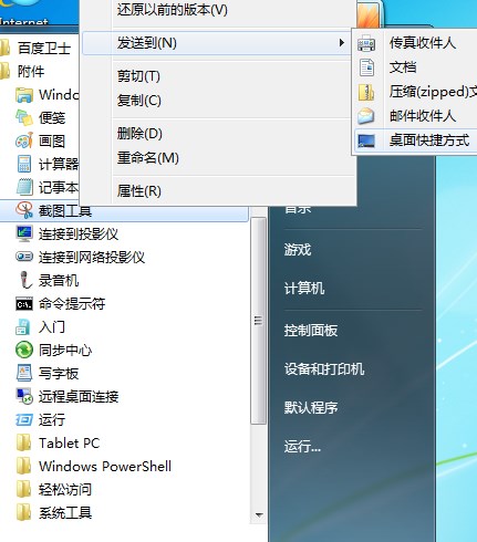 2、在下面找到“截圖工具”,單擊鼠標(biāo)右鍵,選擇“發(fā)送到”—“桌面快捷方式”;