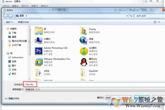5、保存:按下Ctrl+S快捷鍵,在彈出的窗口中選擇文件類型:所有文件(*.*),在文件名處輸入文件名,在文件名后面輸入“.vbs”或“.vbe”,保存。