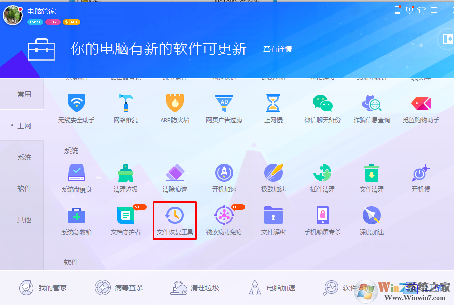 2、在隨后打開的窗口中,切換到”系統(tǒng)“選項卡,然后找到”文件恢復(fù)工具“單擊,程序會自動下載該小工具。