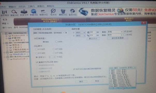 如果存在這種情況那就說明您沒有把固態(tài)硬盤徹底的分區(qū),開頭還隱藏著一個很小的主引導(dǎo)分區(qū),最徹底的解決辦法就是重新做一下固態(tài)硬盤的分區(qū),在U盤pe系統(tǒng)中使用diskgenius 進(jìn)行分區(qū),把每個分區(qū)都刪掉,使硬盤徹底的處于情況狀態(tài),只有一個大分區(qū),然后把硬盤改為MBR模式,蓋好之后不是很懂的用戶就選著快速分區(qū),幾個分區(qū)就視自己的具體情況而定了,但是一定要選著右下角的4k對齊也就是右下角的扇區(qū)數(shù)額選擇到4000+,關(guān)于這大家可以參考小編寫的另外一篇文章:固態(tài)硬盤分區(qū)并4k對齊 (直接點(diǎn)擊即可進(jìn)入)