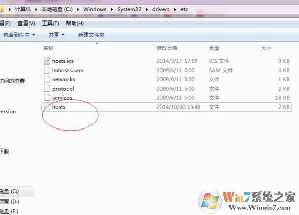 1、打開(kāi)C盤,在目錄C:\Windows\System32\drivers\etc 下找到hosts文件