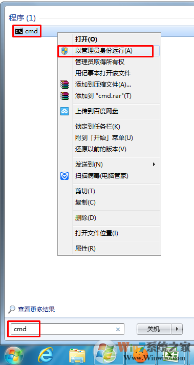 1、開始-搜索欄輸入cmd-右鍵選擇以管理員省份運行